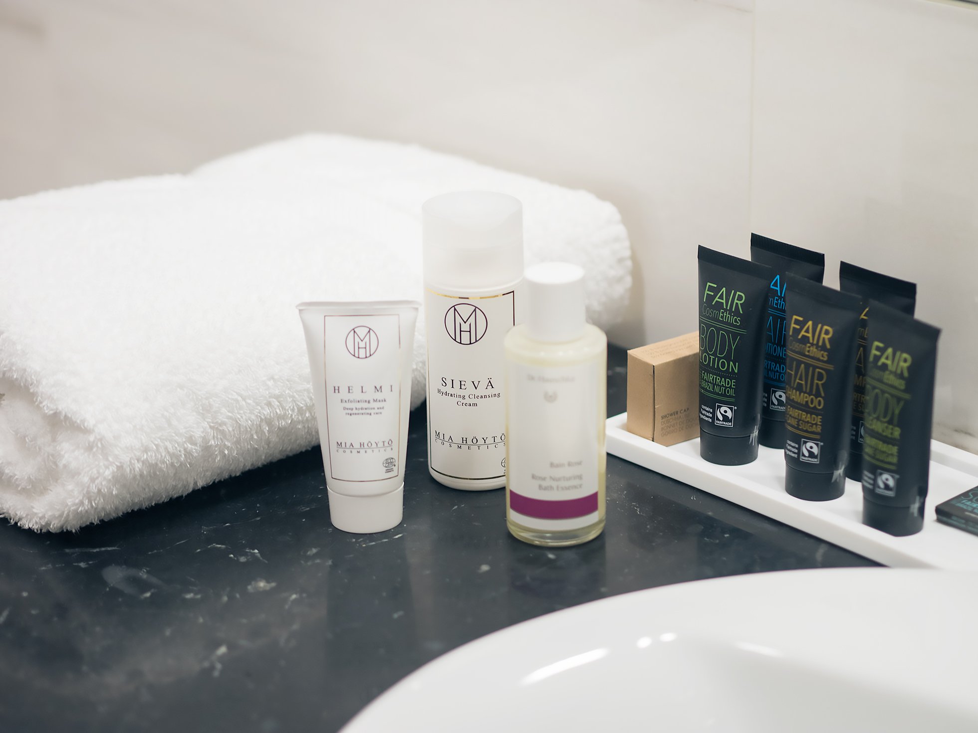 Hemmottelin hotelliyön yhteydessä itseäni ihanilla Mia Höydön uutuustuotteille Helmi heleyttävällä kuorintanaamiolla* ja Sievä puhdistusvoiteella*. Iltapäivällä sujahdimme hotellihuoneen kuumaan kylpyyn, jonne lorautin reilusti hoitavaa Dr. Hauschkan ruusu kylpyöljyä*. ( *tuotteet saatu blogin kautta)
